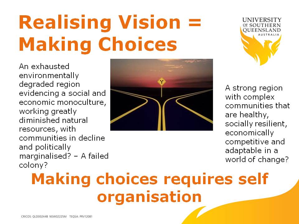 Indeed realising a vision is about making choices and positioning to be able to make choices is about self organisation – a core function of resilience.