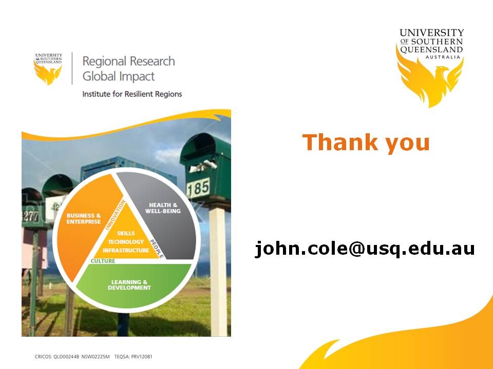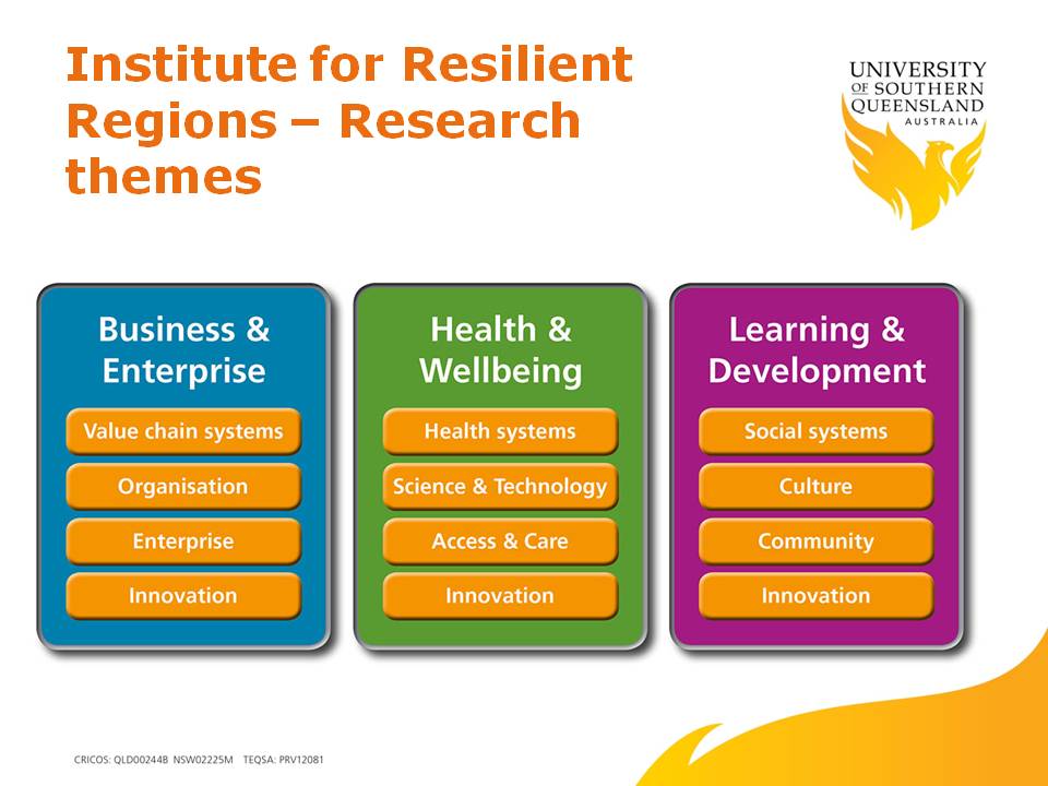 Today I am going to talk about resilience and regions, starting with an outline of the Institute for Resilient Regions (IRR) at USQ.  I will then address the following items: