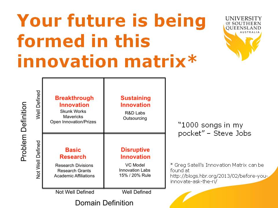 Right now your future is being formed in the various quadrants of this innovation matrix, most likely in the right hand entrepreneurial column versus the left hand column which is characterised by the directed “managed”” bureaucratic investment.