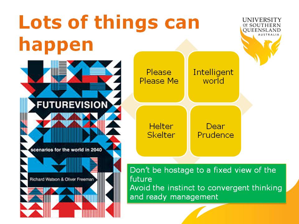 So in plotting out the different scenarios your organisation, community or region might entertain, please avoid the rush to agreement and attempting to “manage the un-manageable”  ie those things that are still in formation or are not yet known.