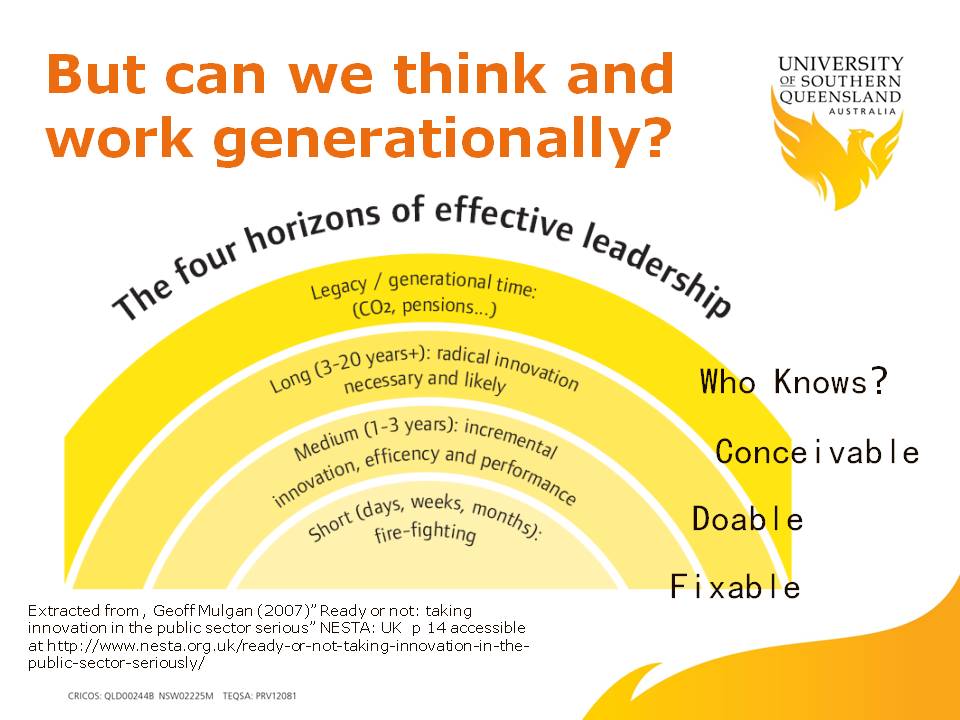 The leaders of the western democracies particularly seem preoccupied with time frames of days, months and at most an electoral cycle.  Indeed, the question can be asked:  “Are we capable of long term or inter-generational vision and acting on that vision?  Or is it, in the modern political world of spin, ‘announcables’ and short media cycles and immediate kudos, simply inconceivable?