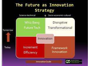 If we think of the future as innovation strategy then again the quadrant matrix is useful as a schematic in which to organise various pathways and conditions.